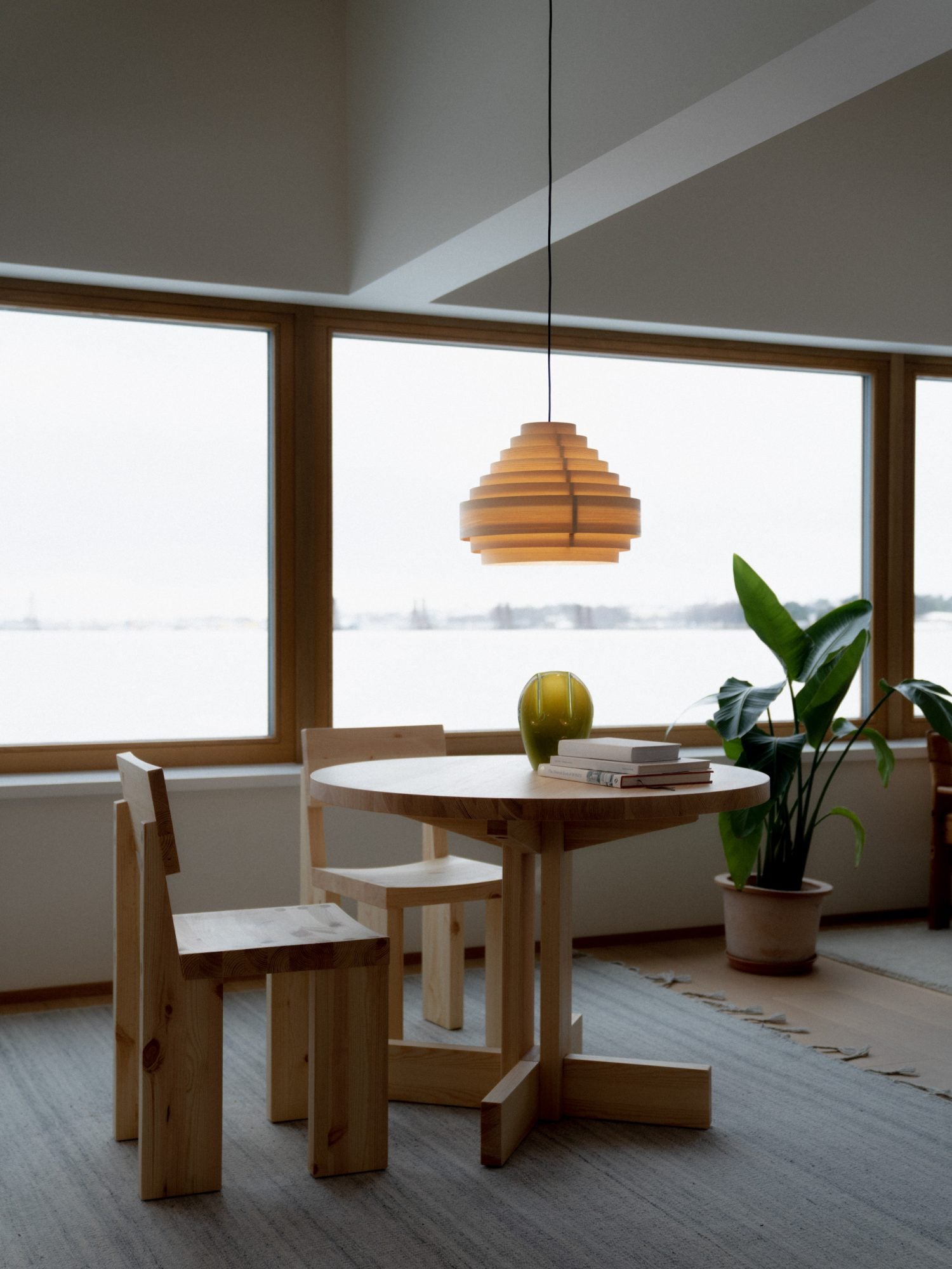 Just as the Dining Chair makes no excuses for its heft, Fredrik Paulsen’s round wood dining table is similarly forthright about its purpose. This is a solid wood dining table designed to work hard for generations to come. The lively grain of Finnish pine is especially present over the table’s large surface areas, while the simple logic and artistry of its making remain enjoyably explicit.