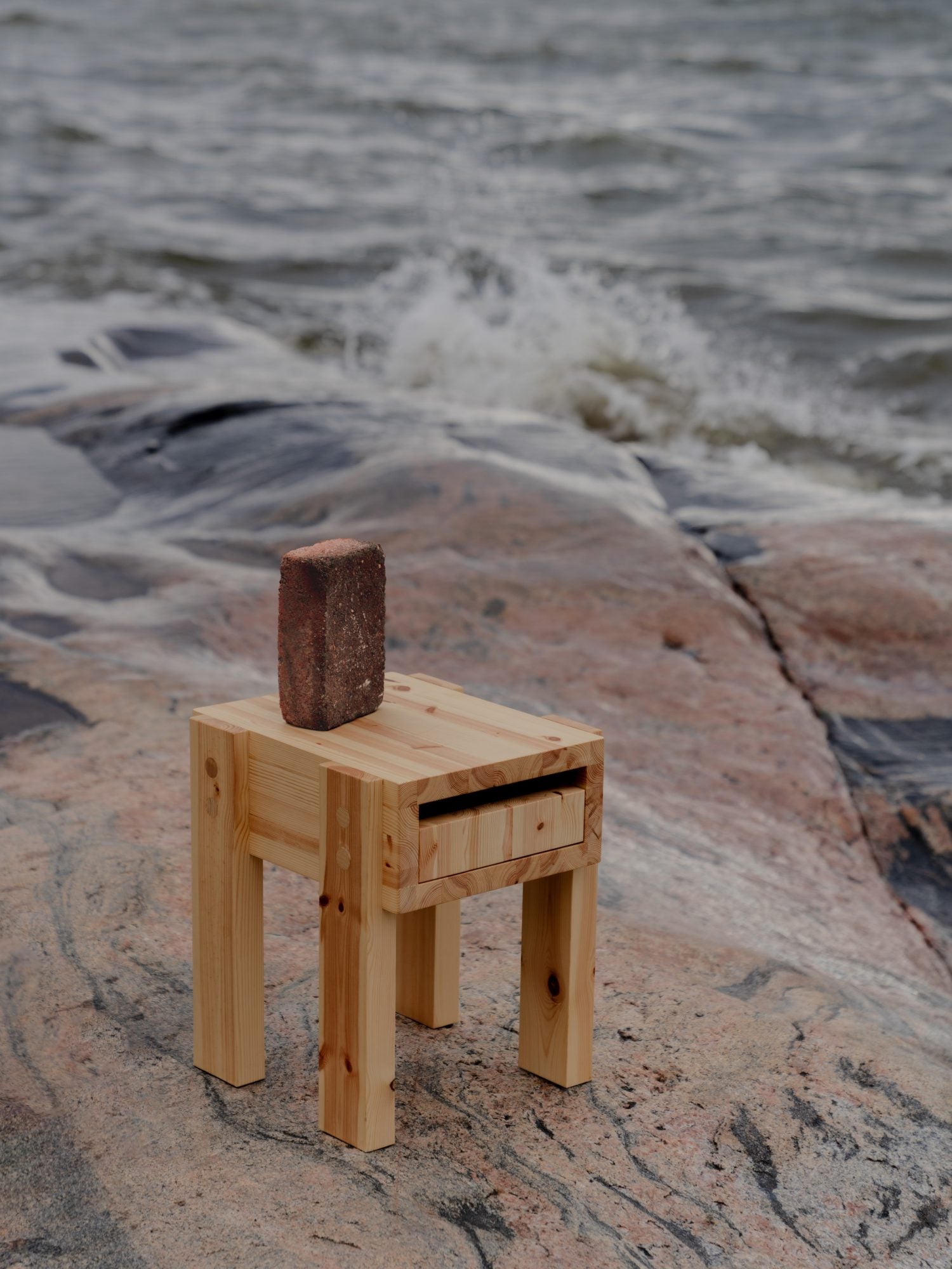 The Stilts Side Table consists of a floating volume elevated above the ground. The form is inspired by the vernacular architecture of lakeside cabins common in both Quebec, from where designer Philippe Malouin hales, and in Finland. In the spirit of these informal buildings, over-engineered solutions have been rejected in favour of an intuitive structure. Therefore, the Side Table is simple but effective; a box drawer sits inside a cavity whilst legs support and enclose the volume in a matter-of-fact way; an honest design made from the most honest of materials.